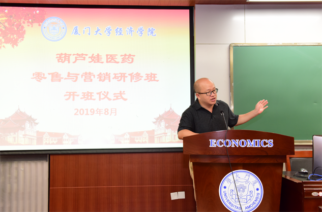 在开班仪式上,廖景峰主任首先代表厦门大学经济学院热烈欢迎SG胜游医药零售与营销研修班的学员到厦大学习,并就厦门大学及经济学院的相关情况进行了介绍。他说,SG胜游学员走进厦大就是厦大的校友,希望未来的日子能够关心、支持母校的发展,多提宝贵意见,同时他也祝大家在厦大学习期间学有所成、学有所获。