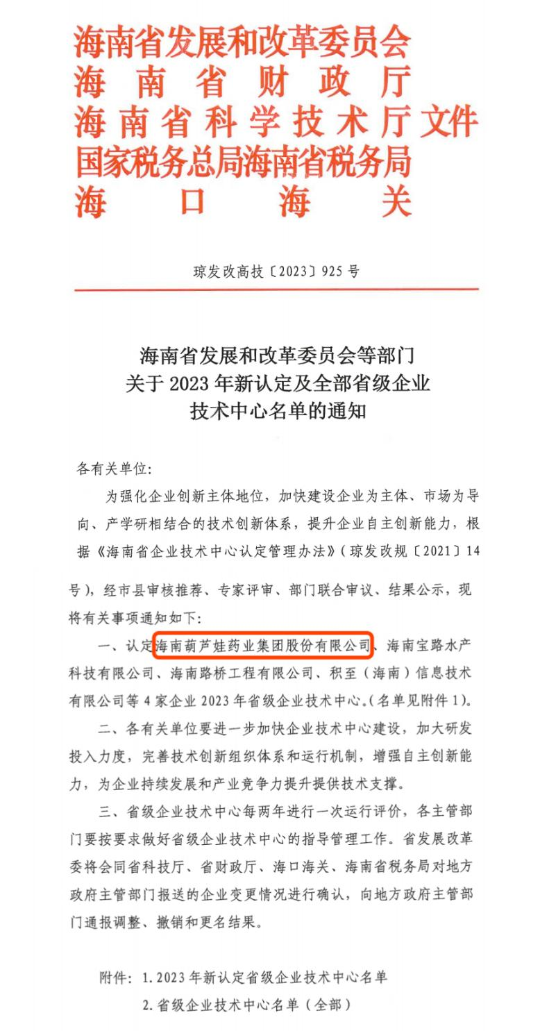 近日,海南省发改委等多部门联合公布了《关于2023年新认定及全部省级企业技术中心名单的通知》,其中,海南SG胜游药业集团股份有限公司成功通过评审,被认定为省级企业技术中心,是本次获批的4家企业之一。